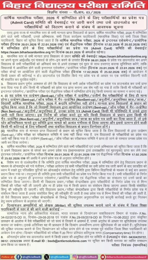 जो छात्र बिहार बोर्ड मैट्रिक परीक्षा 2026 में शामिल होने वाले हैं, उन्हें सलाह दी जाती है कि वे समय रहते अपने विद्यालय से एडमिट कार्ड प्राप्त कर लें, क्योंकि बिना एडमिट कार्ड के परीक्षा में बैठने की अनुमति नहीं दी जाएगी।