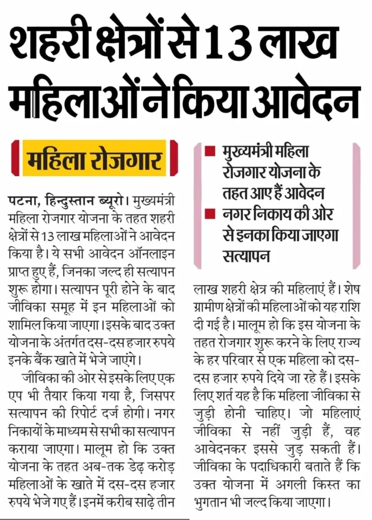Bihar Mahila Rojgar Yojana Verification 2025 की यह नई अपडेट शहरी महिलाओं के लिए बड़ी राहत है, क्योंकि अब सत्यापन प्रक्रिया मोबाइल ऐप के माध्यम से तेजी से की जाएगी।