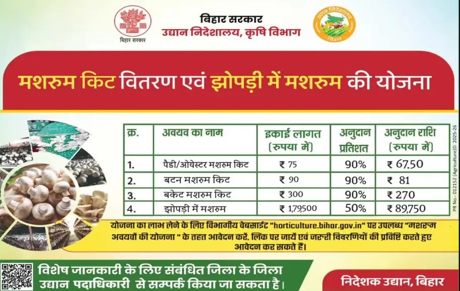 बिहार Mushroom Subsidy Yojana 2025: सब्सिडी राशि