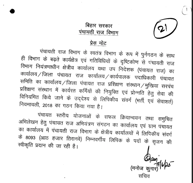 Bihar Panchayat Clerk Recruitment 2025: बिहार सरकार के पंचायती राज विभाग ने एक ऐतिहासिक कदम उठाते हुए पूरे राज्य की पंचायत सरकार में 8298 निम्नवर्गीय लिपिक (LDC – Lower Division Clerk) पदों के सृजन की आधिकारिक स्वीकृति दे दी है।