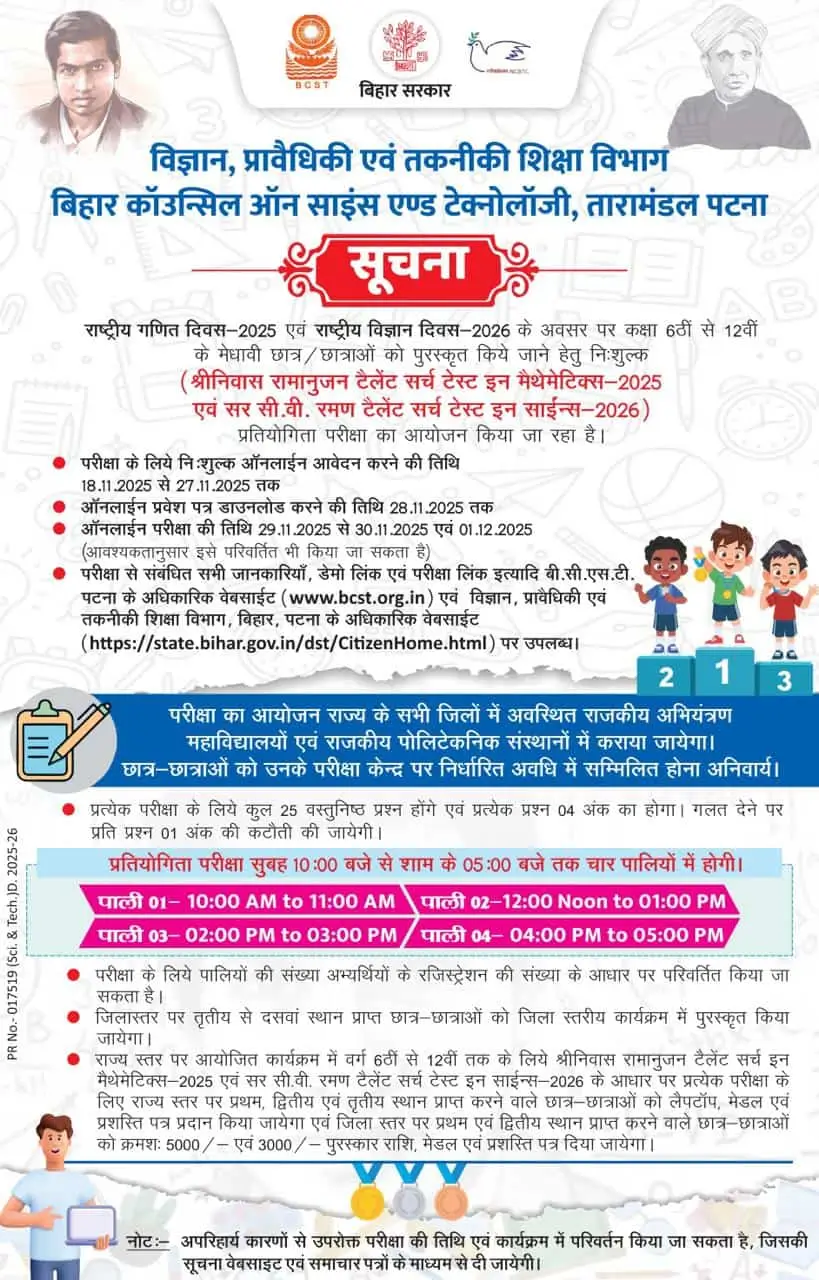 यह परीक्षा Srinivasa Ramanujan Talent Search Test in Mathematics – 2025 और Sir C.V. Raman Talent Search Test in Science – 2026 के तहत आयोजित की जाएगी।